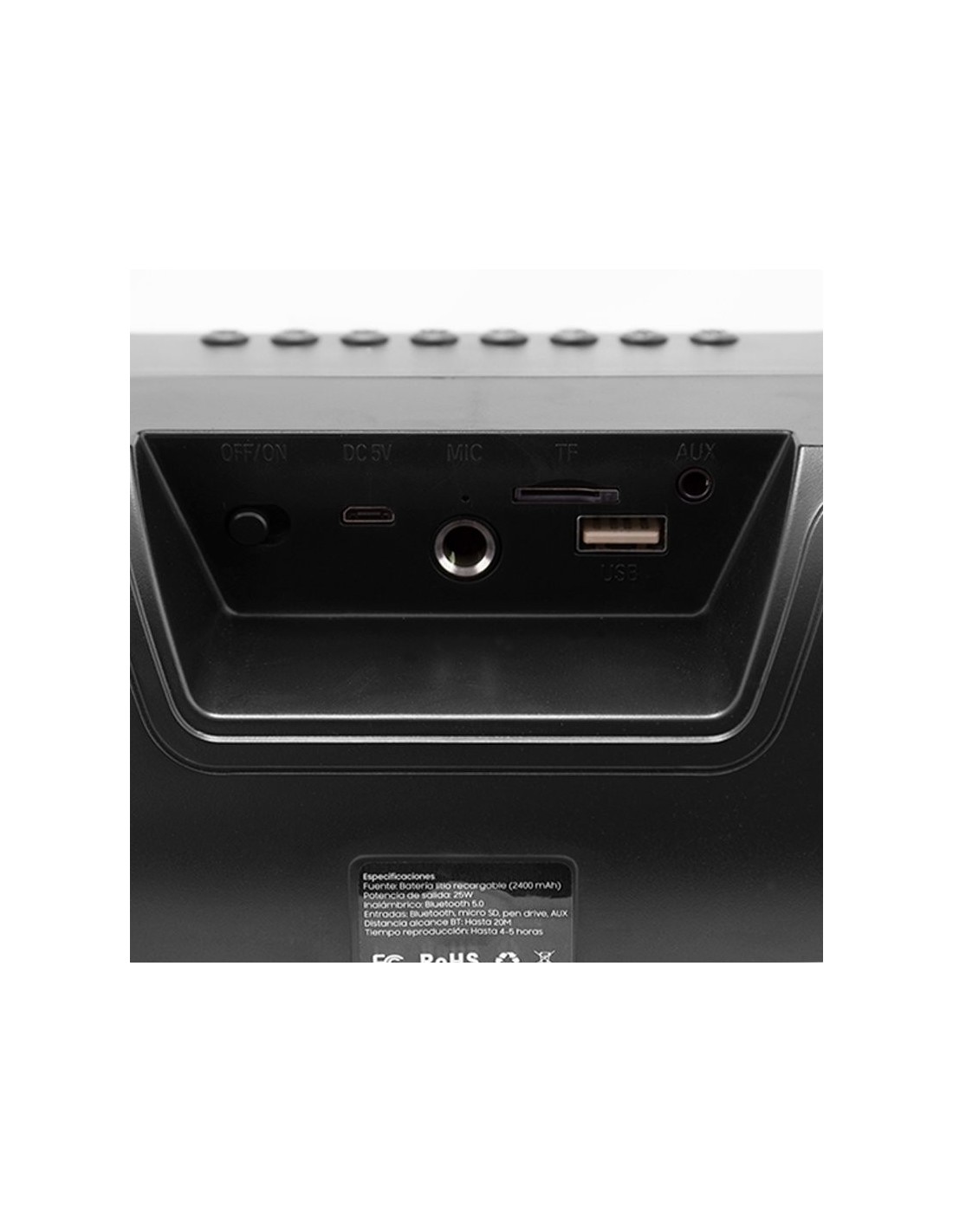Cuenta con ranura para tarjeta Micro SD y USB. Reproducción en formato MP3 y otros. Apagado automático tras 30 min. si se desconecta el Bluetooth.