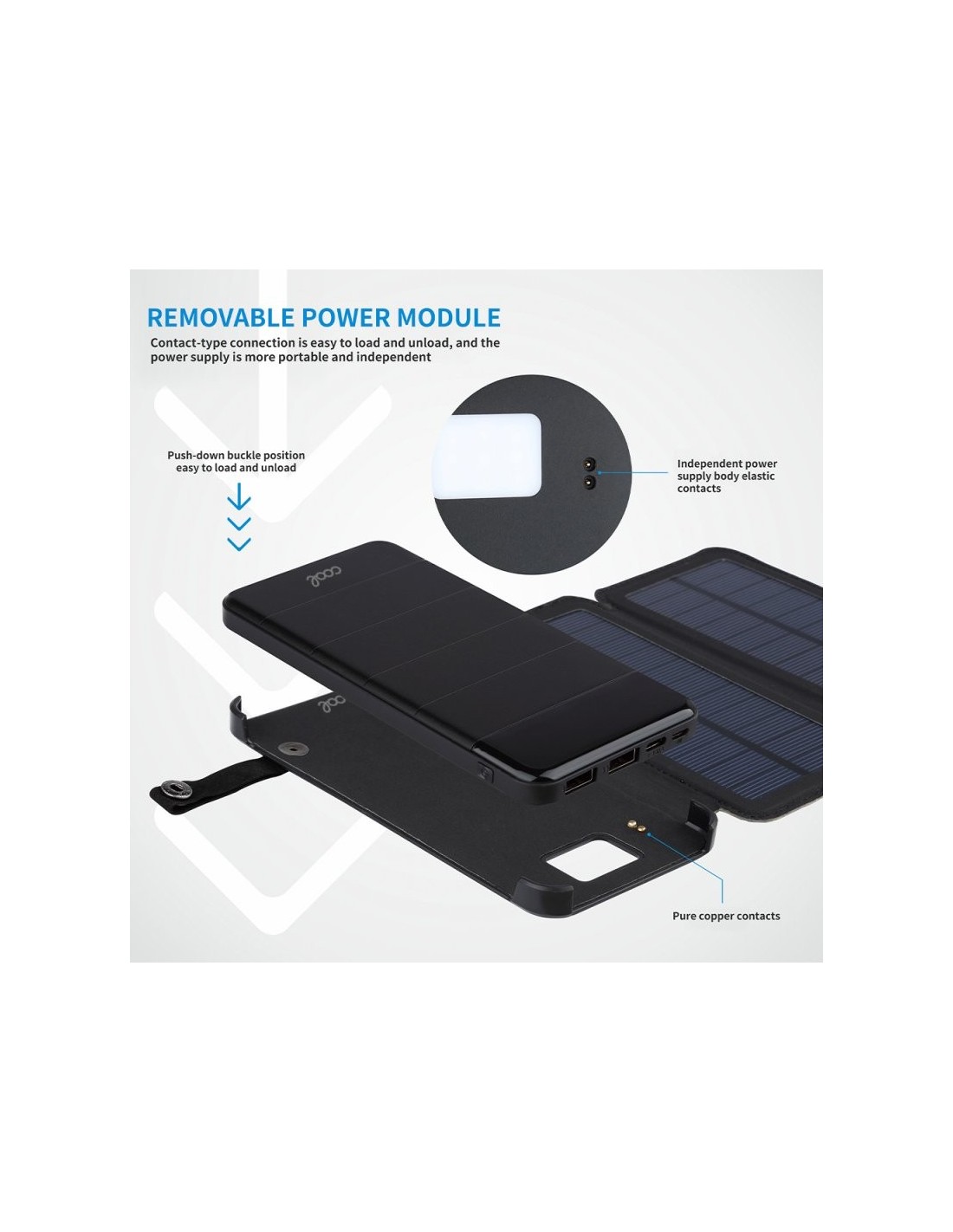 Incorpora 4 paneles solares plegables, los cuales se autorecargan, tanto con luz solar, como con luz artificial. Incorporan en la pantalla frontal, un led verde indicador de si está recibiendo carga a través de los paneles.