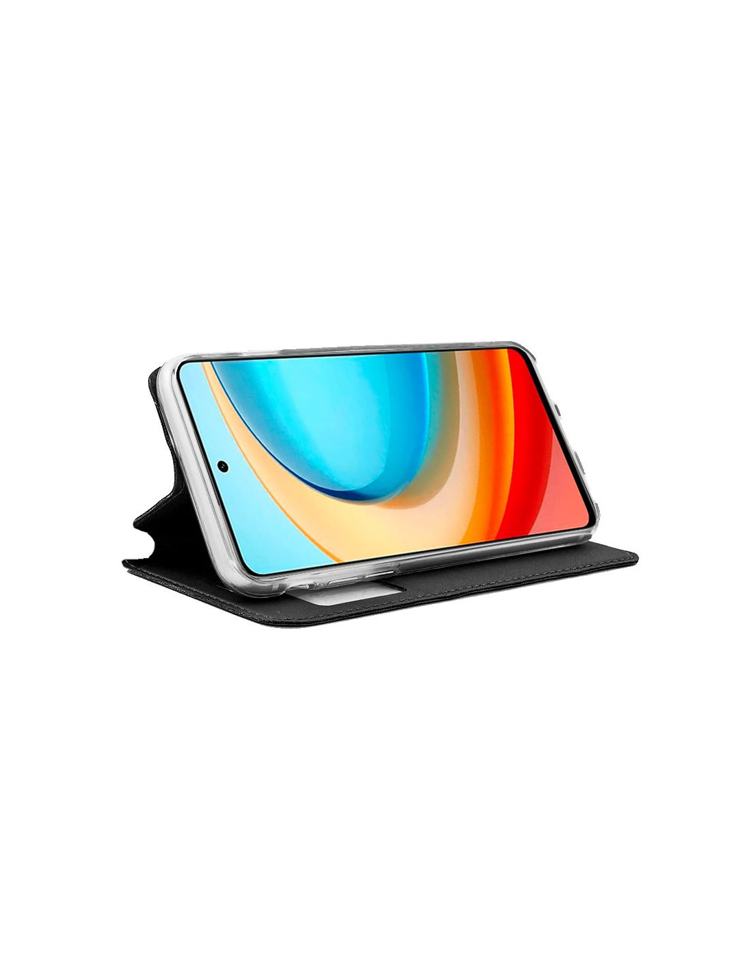 Apertura lateral tipo libro. Incorpora una carcasa específica del modelo de smartphone, para incrustarlo y dejarlo perfectamente encajado.