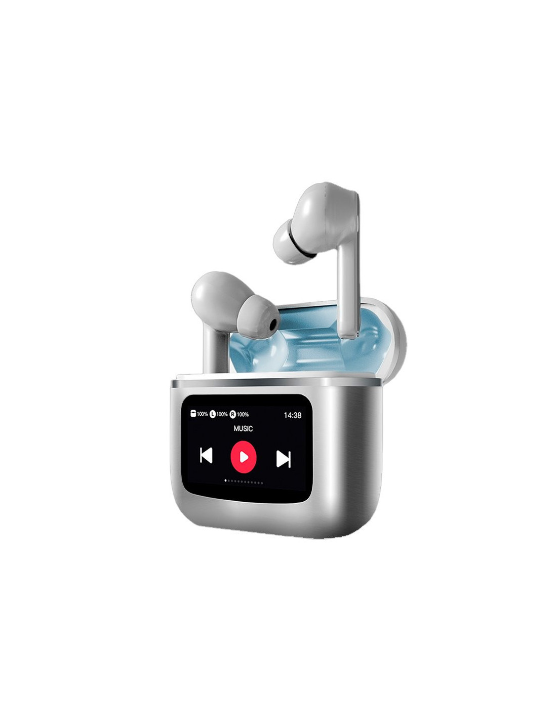 Auriculares estéreo Bluetooth para escuchar música y hablar por teléfono gracias a su conexión bluetooth. Novedoso diseño con pantalla táctil multifunción intengrada en la caja cargadora.