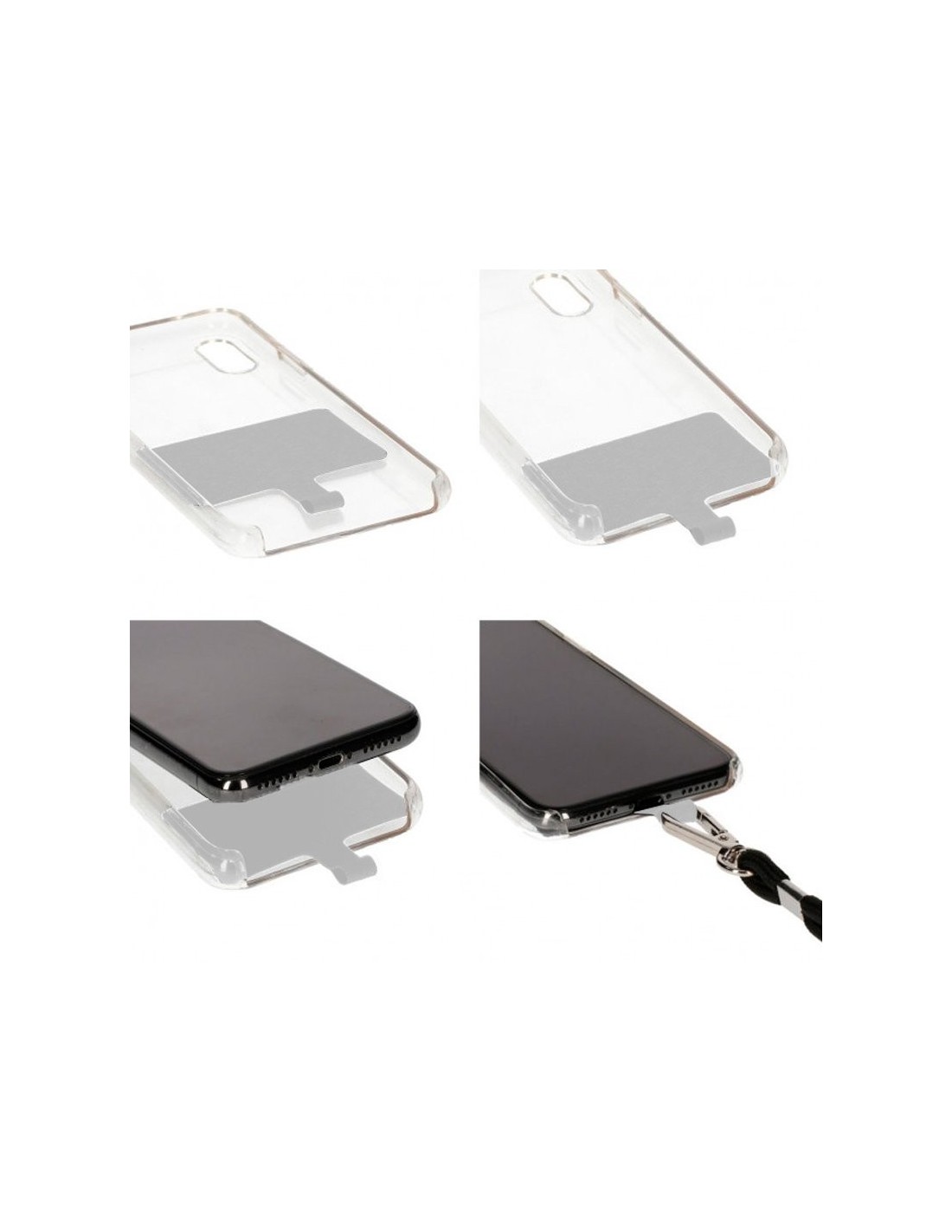 Con sistema de fijación mediante una tarjeta de plástico incluida que se introduce en la funda o carcasa del smartphone, y de la que sale un aro al que se engancha el cordón.