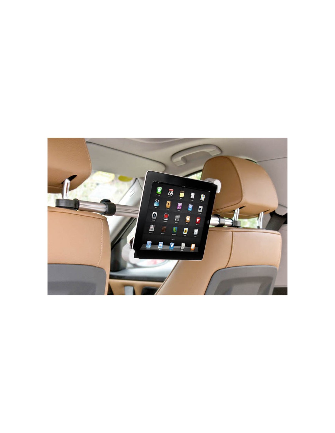 Esta barra ajustable para tabletas se fija entre los dos reposacabezas de los asientos delanteros, y dispone de un sistema de bloqueo con cuatro puntos de anclaje para ofrecer la máxima estabilidad y seguridad.