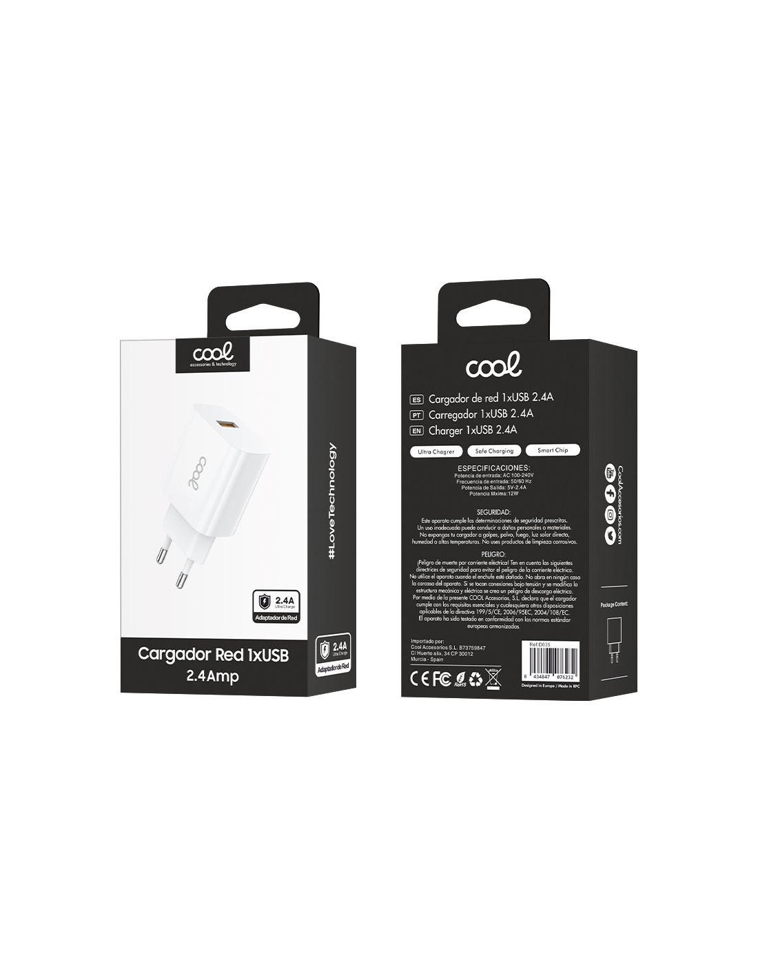 Cargador de red universal, con entrada USB para conexión de cables con esta entrada universal. Potencia de 12W cada puerto USB.