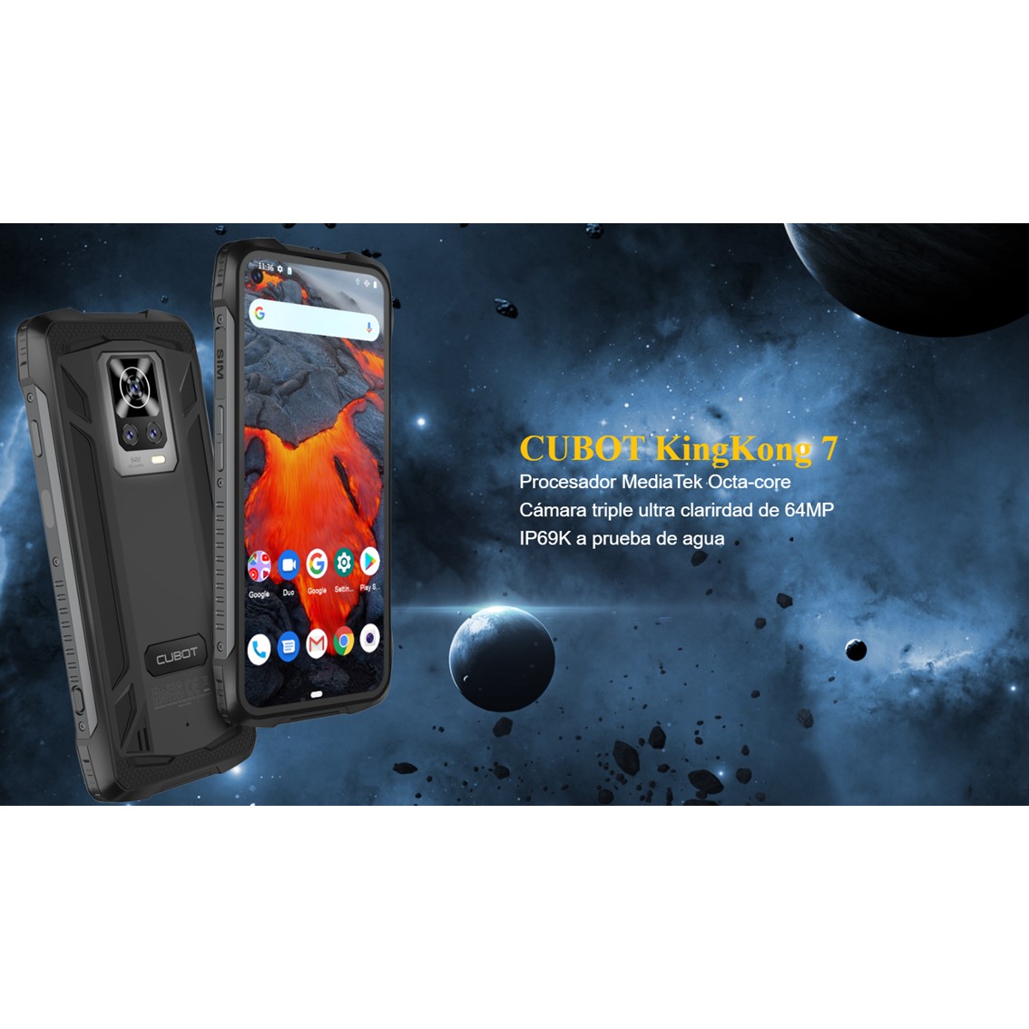 OctaCore P60 MT6771V/CA, 6,36" IPS FHD+, 128GB / 8GB RAM, Cámara 64+16+5 MPx, Frontal 32 MPx, 5000 mAh, IP69K, Huella