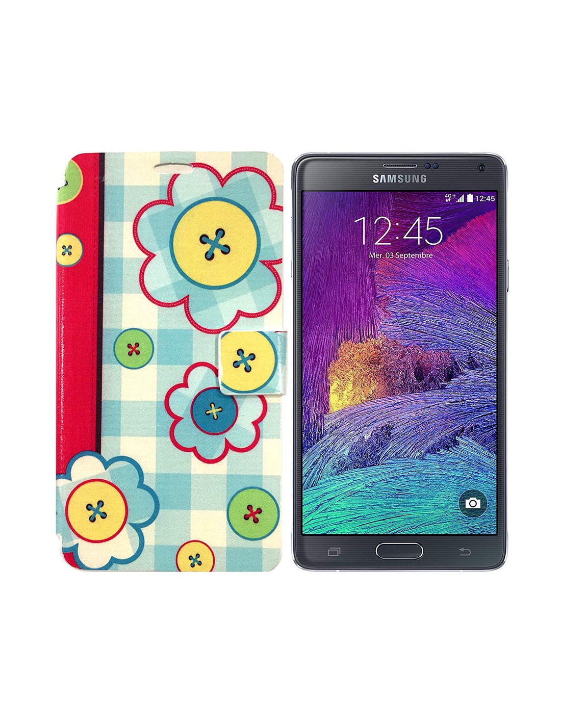 Funda libro soporte rígido Samsung Galaxy Note 4 diseño Flores botones azul celeste