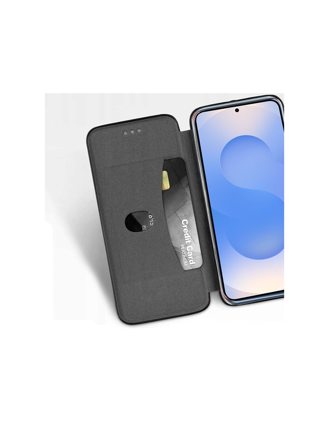 Incorpora en uno de los lados interiores, un bolsillo para meter tarjetas. También puedes mantener tu smartphone apoyado tanto de manera vertical como horizontal, para ver tus vídeos favoritos, ya que el pliegue de la funda hace de soporte.