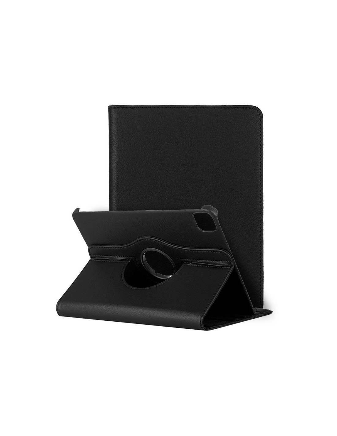 Material polipiel. Con su diseño giratorio, permite sostener el iPad en posición tanto horizontal como vertical. Presentada en caja-blister. Excelente calidad.