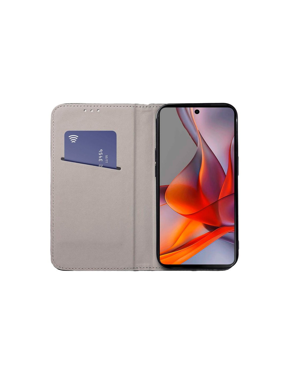 Apertura lateral tipo libro. Incorpora una carcasa específica del modelo de smartphone, para incrustarlo y dejarlo perfectamente encajado.