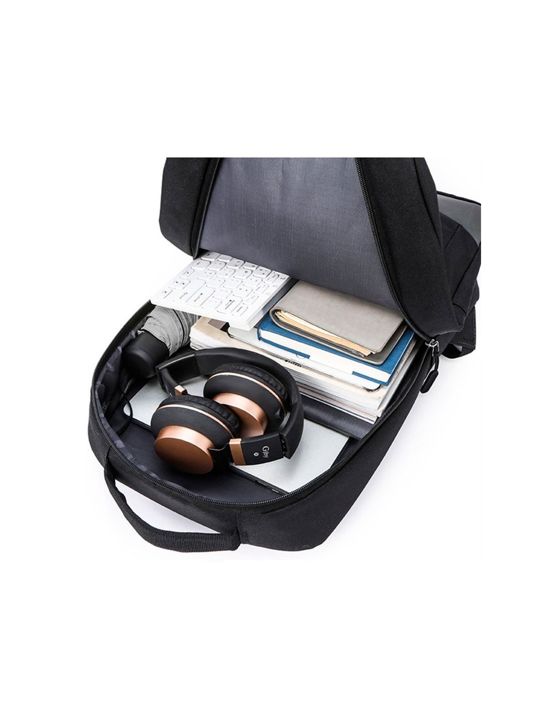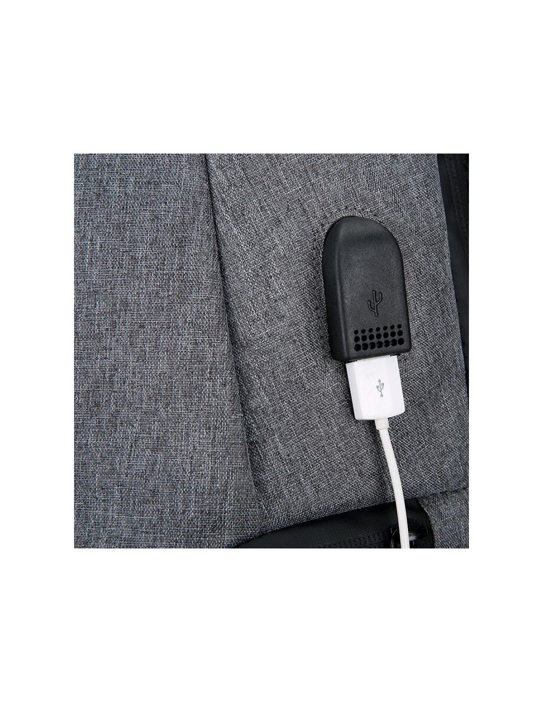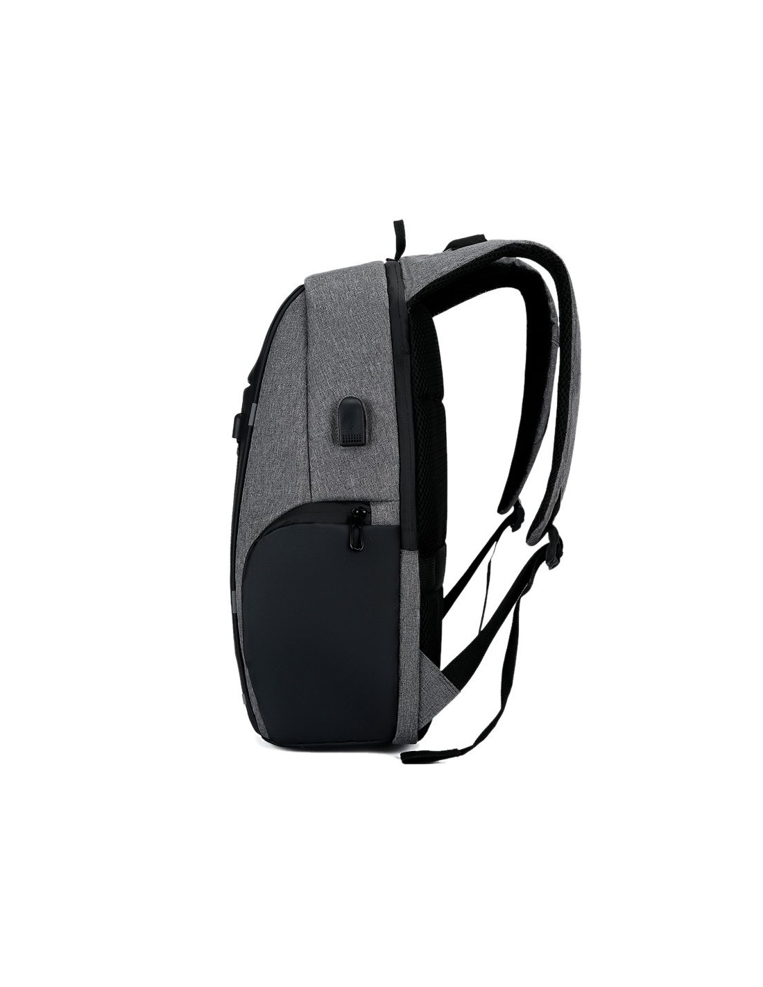 Incorpora bolsillo con cremallera central, bolsillo externo y compartimento interior, y puerto USB con cable comunicado a un bolsillo pequeño interior con cable USB en el interior de la mochila.