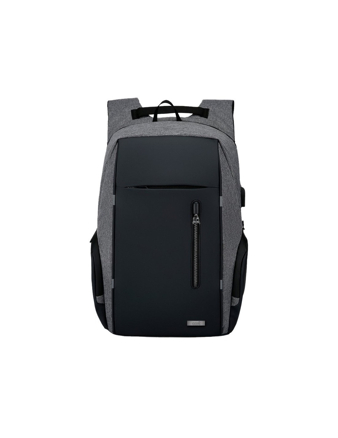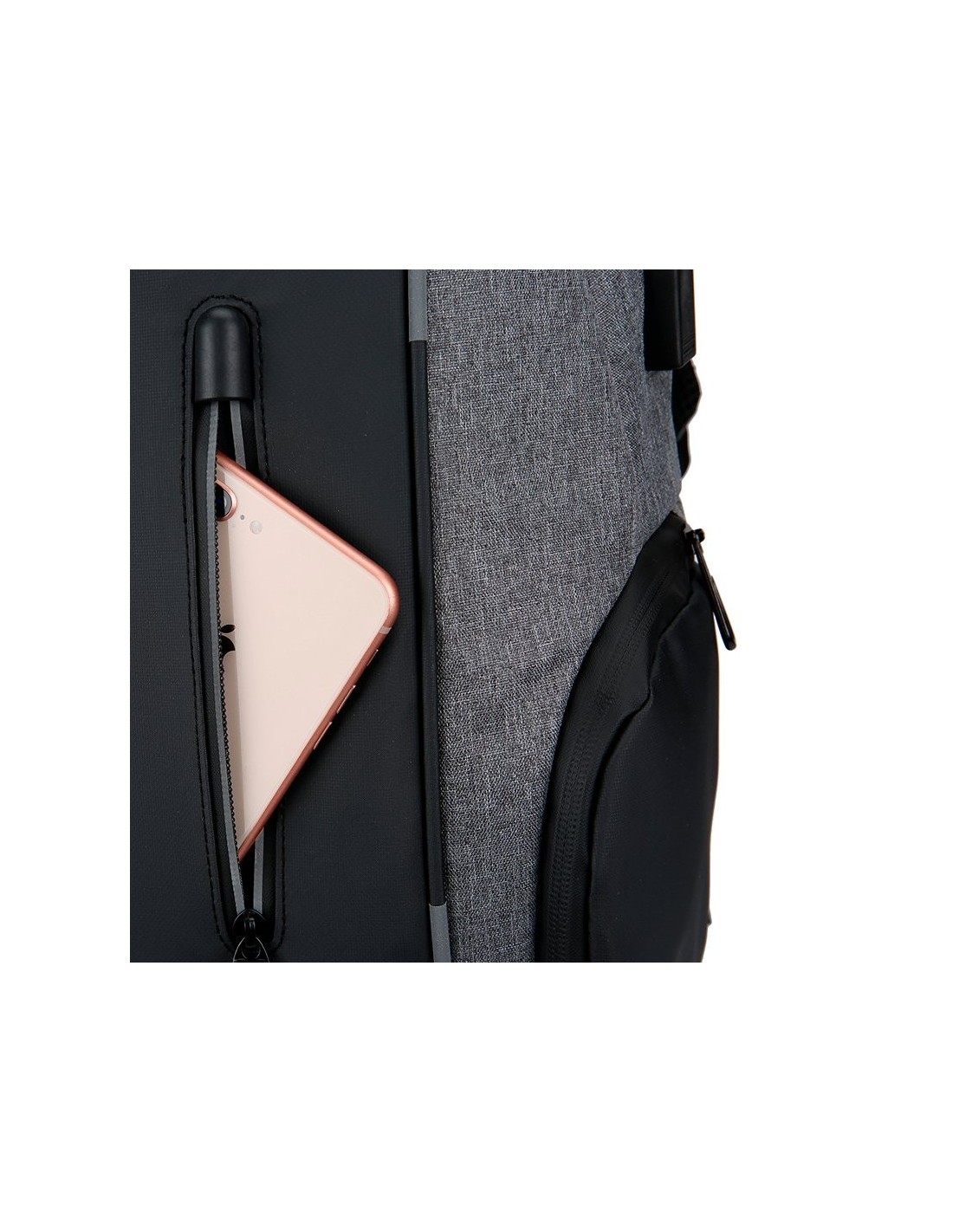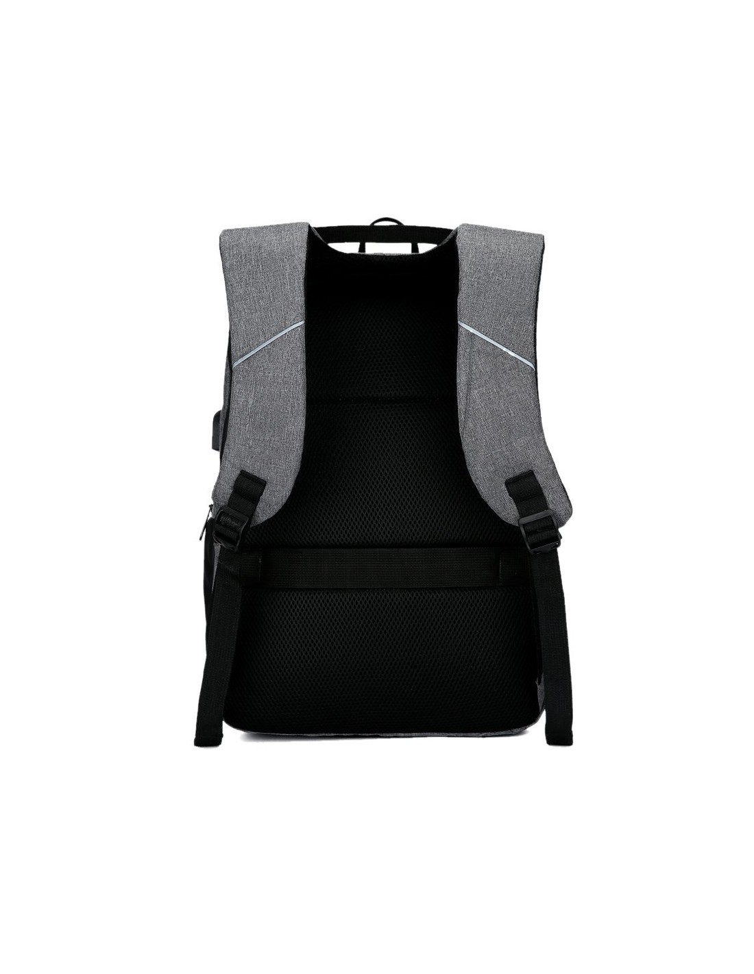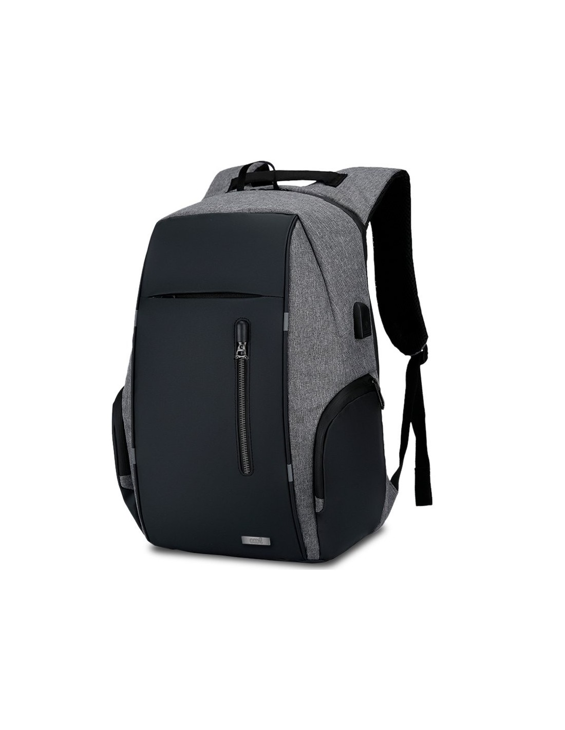 Incorpora bolsillo con cremallera central, bolsillo externo y compartimento interior, y puerto USB con cable comunicado a un bolsillo pequeño interior con cable USB en el interior de la mochila.