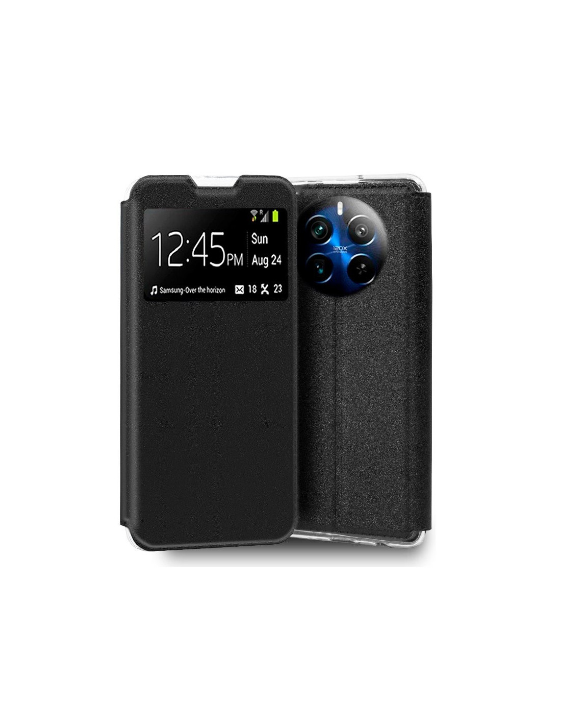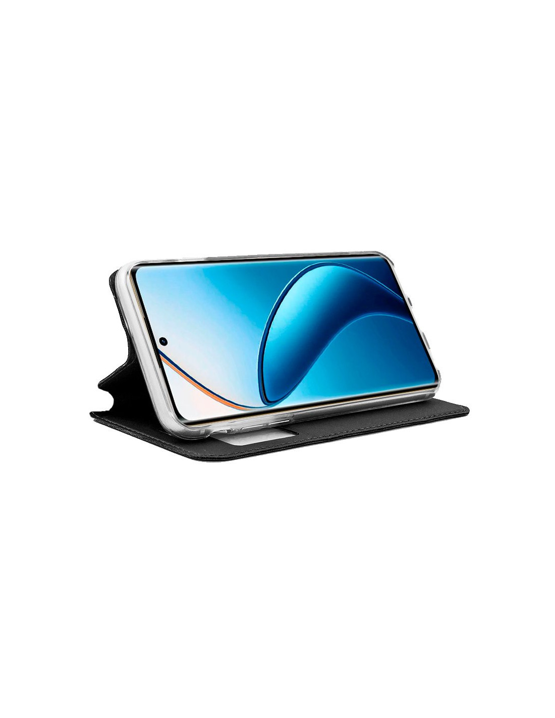 Apertura lateral tipo libro. Incorpora una carcasa específica del modelo de smartphone, para incrustarlo y dejarlo perfectamente encajado.