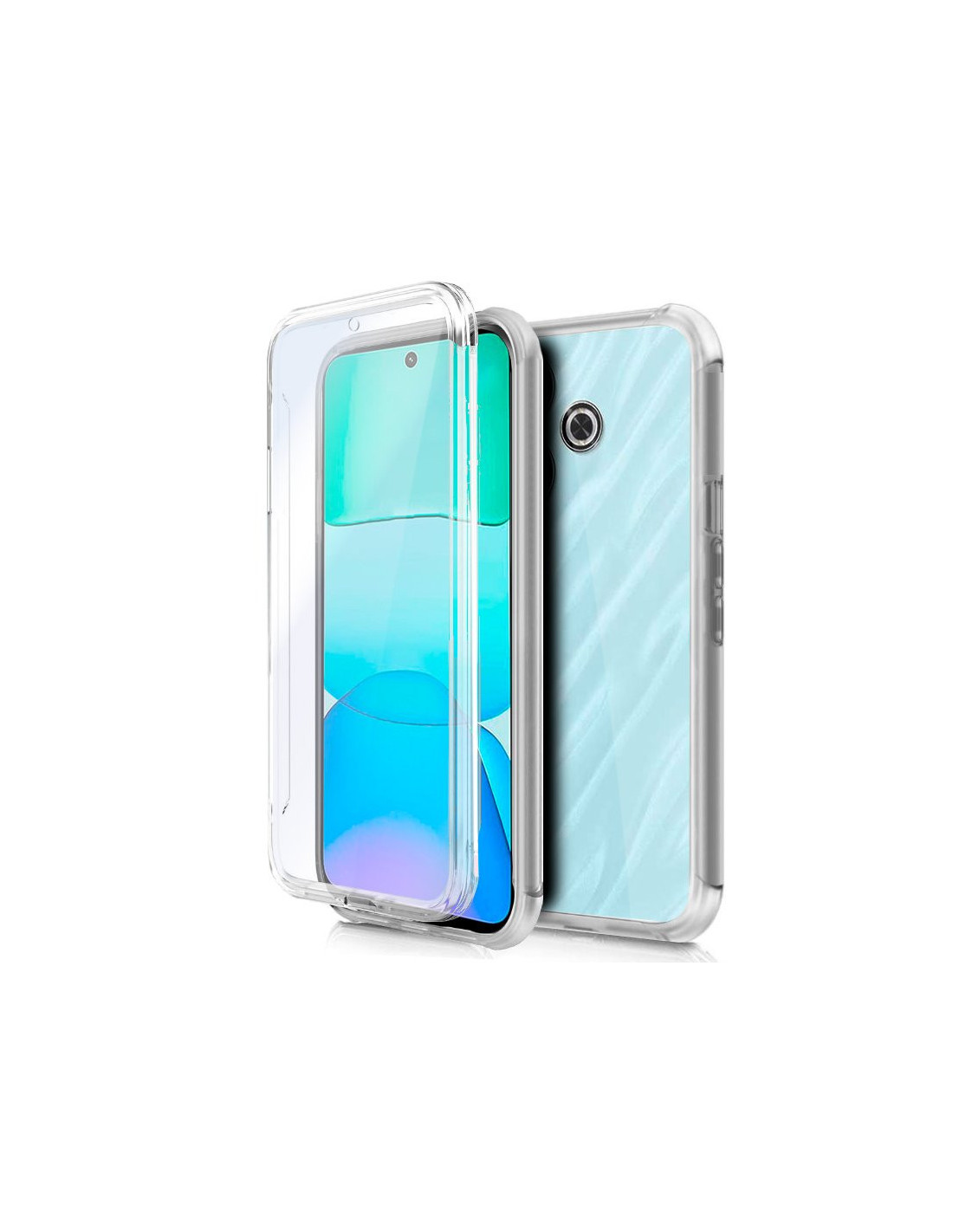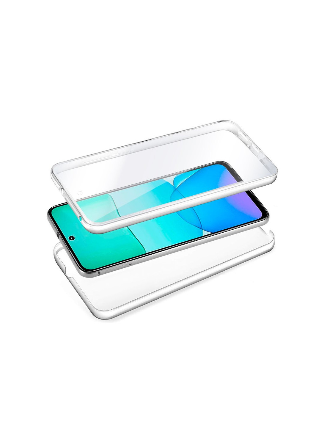 Funda resistente para móvil, de tipo transparente, silicona semirígida 360º, cubre parte frontal y trasera del smartphone.