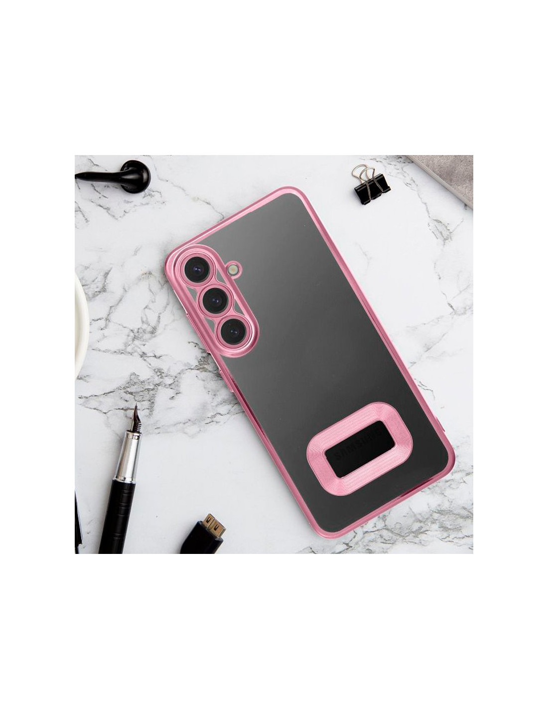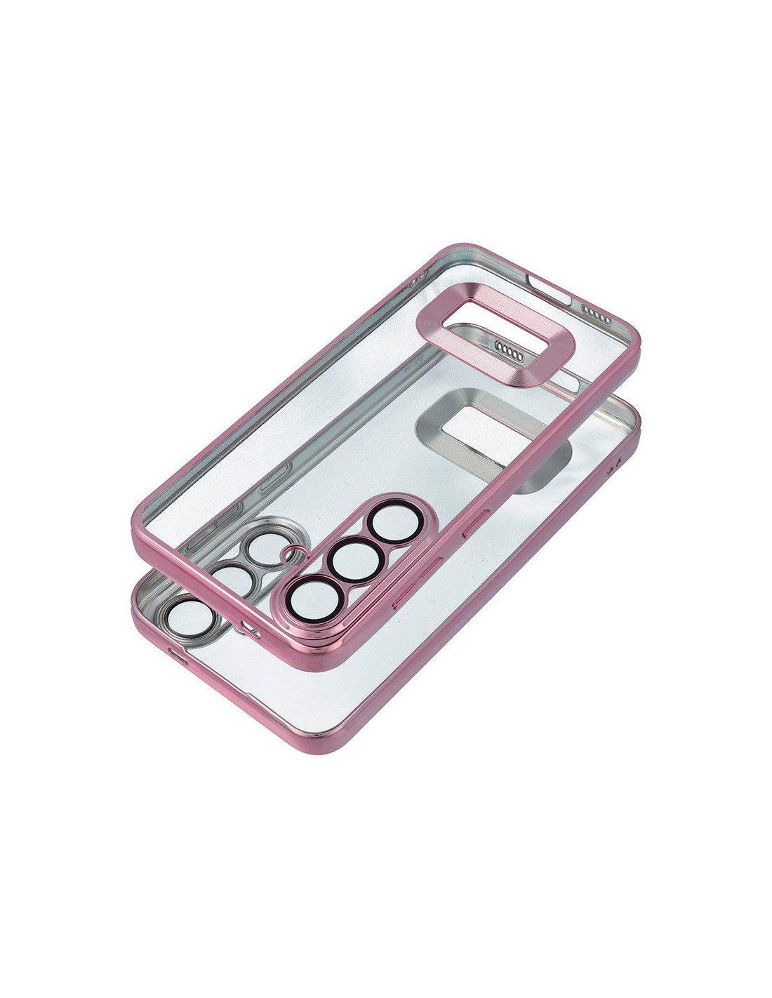 Carcasa totalmente transparente. Acabado metalizado en los bordes tipo bumper.