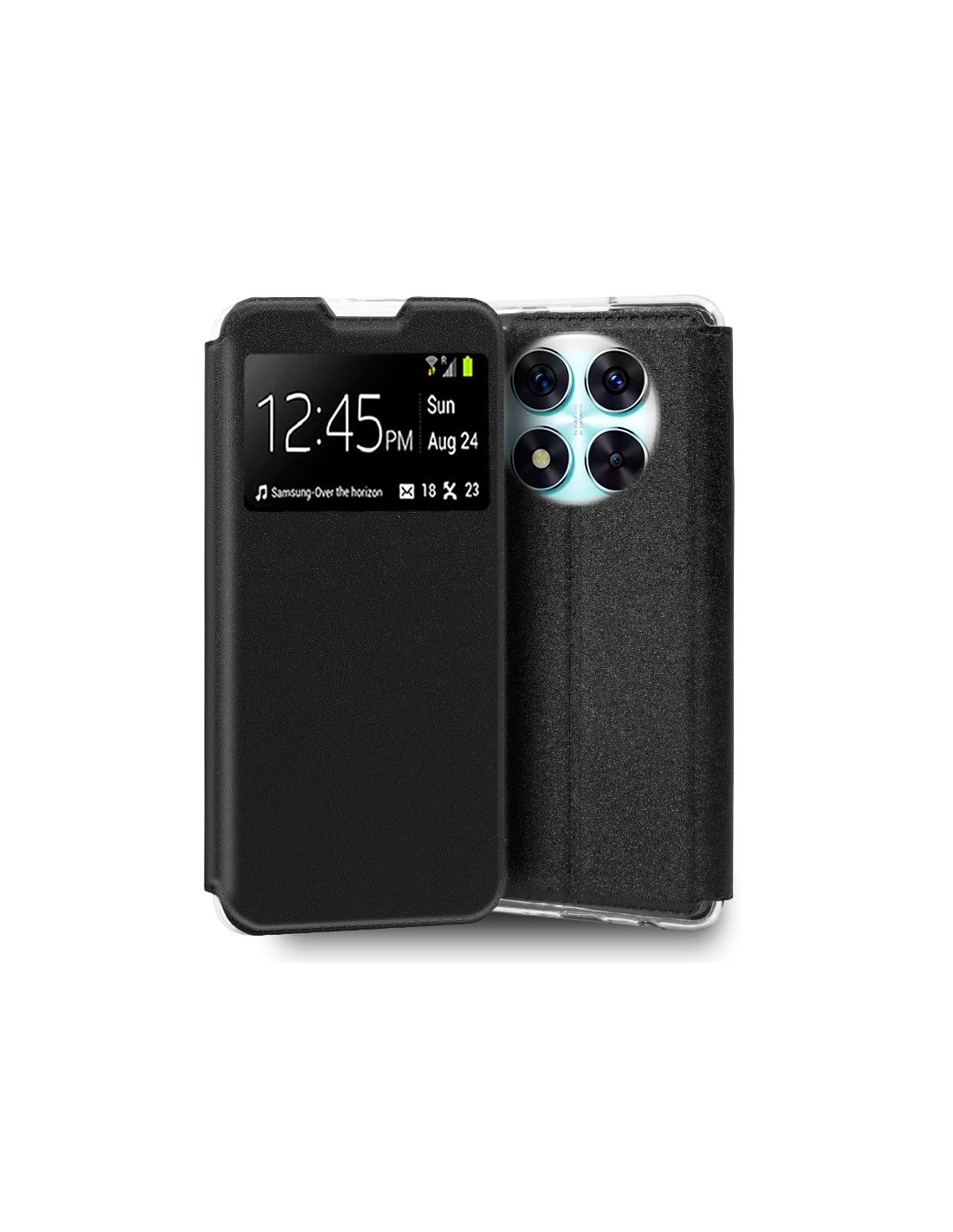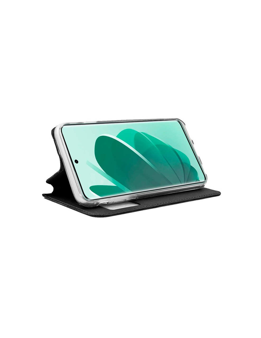 Apertura lateral tipo libro. Incorpora una carcasa específica del modelo de smartphone, para incrustarlo y dejarlo perfectamente encajado.