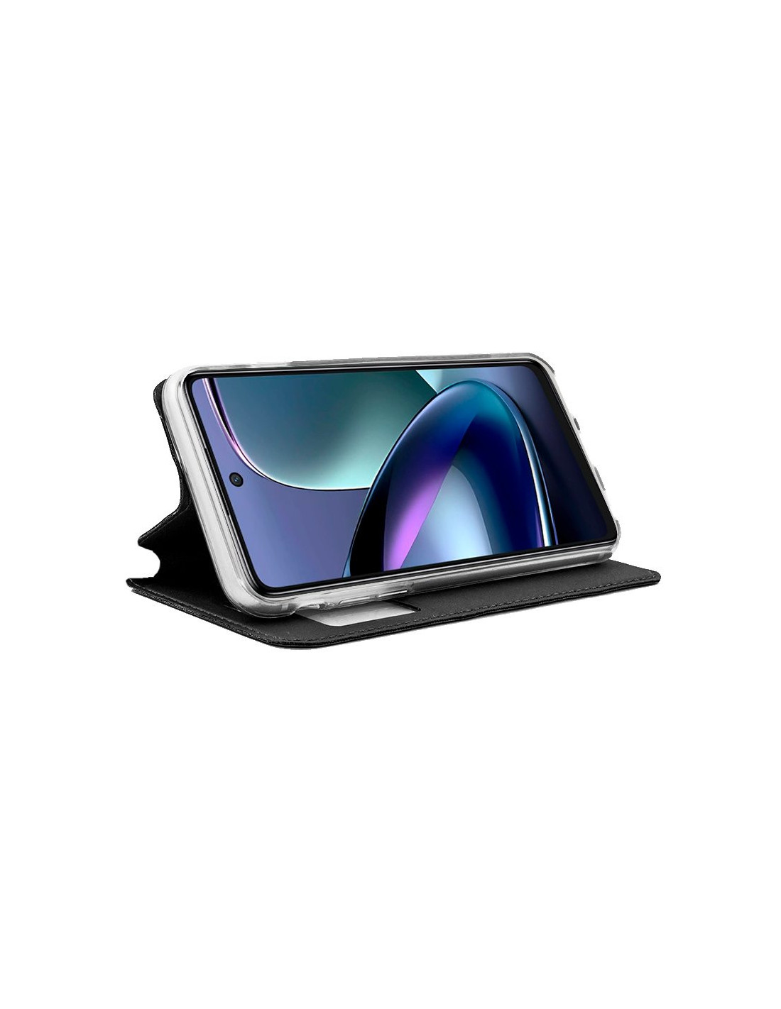 Apertura lateral tipo libro. Incorpora una carcasa específica del modelo de smartphone, para incrustarlo y dejarlo perfectamente encajado.