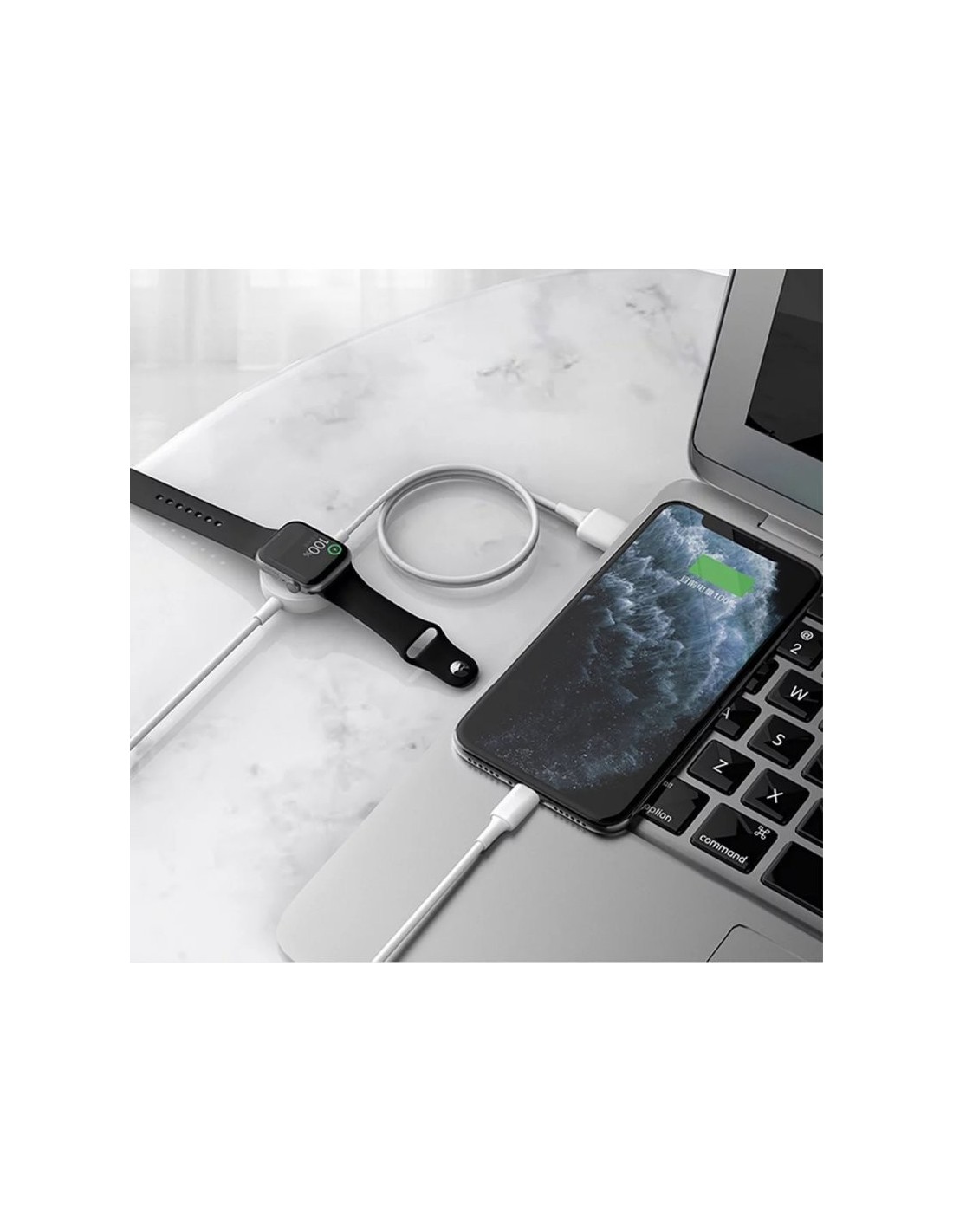 Cable cargador USB 2 en 1 para Apple Watch y dispositivos con puerto 8 pin. Carga tu Apple Watch gracias a su función de carga por inducción donde más lo necesites y, simultáneamente, tu dispositivo Apple con puerto de carga 8pin conectando este cable a un puerto USB o cargador compatible (no incluido). La base integra un imán para mantener el dispositivo estable durante toda la carga.